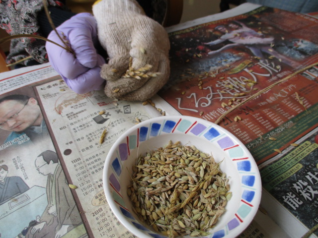 - 10月、さくらの杜の中庭で稲刈りを行いました。春から大事に育てた苗は黄金色に色づき、秋らしい風景です。初めて稲刈りをされる方、田舎で農業をされていた方、皆さんそれぞれ楽しまれていました。「田舎じゃ、よく稲刈り手伝わされたよ」「新米の季節だね!おにぎり作れるかな?」等、自然と話が弾みました!すり鉢とボールを使用して“もみすり”体験も行いました!!